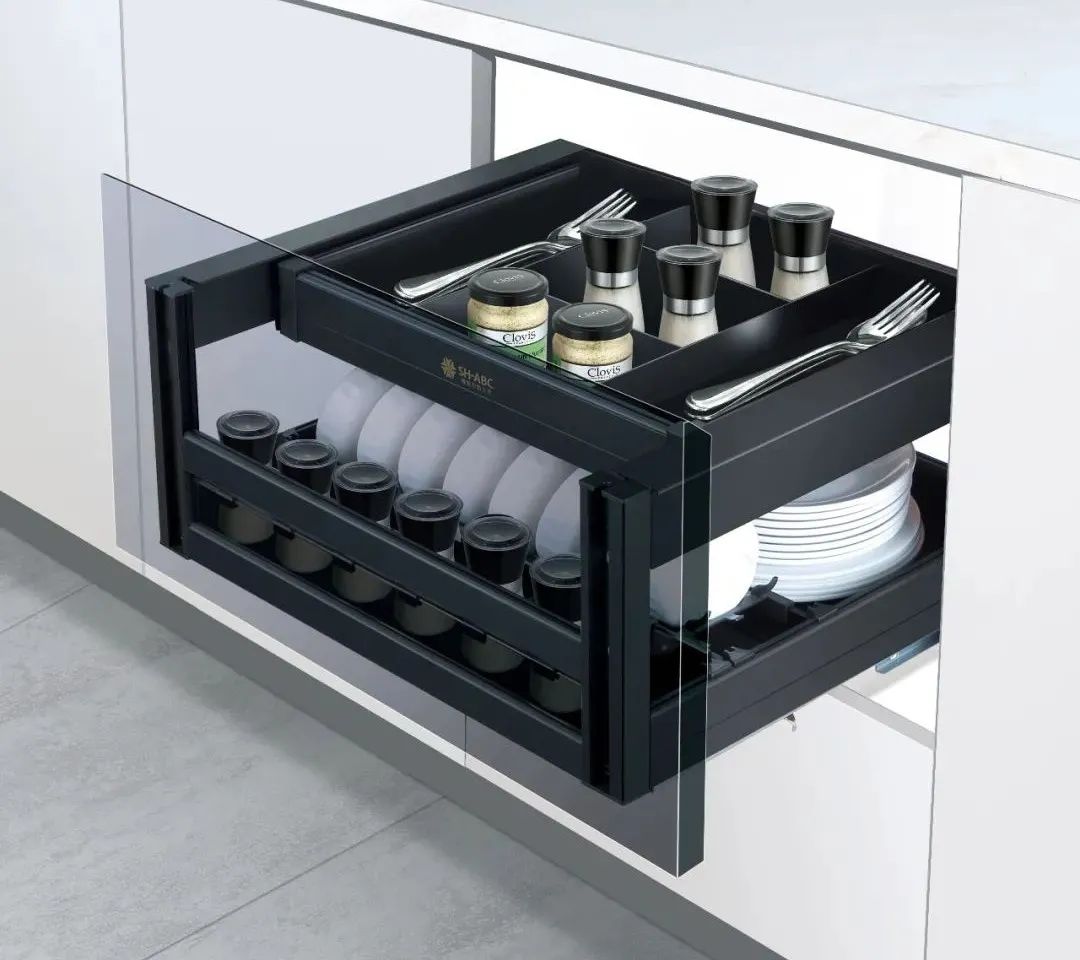 在廚房功能五金區域,星徽精密展出了全鋁星耀系列產品,簡約的設計加上采用全鋁與鋼化玻璃的組合,精細的做工,盡顯全鋁拉籃的輕奢高級。