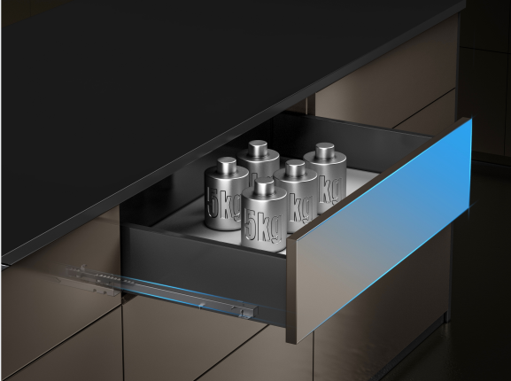 N2全展滑軌,采用兩節隱藏式設計,使用時抽屜可全拉出,充分利用抽屜空間。緩沖滑軌在開合關閉間,更靜音、更順滑,隱藏式設計讓抽屜更顯簡約之美。