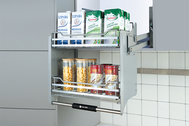 → 功能:可應用于吊柜中,將吊柜巧妙轉化為活動空間,人性化的設計,4檔力度調節功能,可根據存放物品的重量在0-12kg內調節拉力的大小。