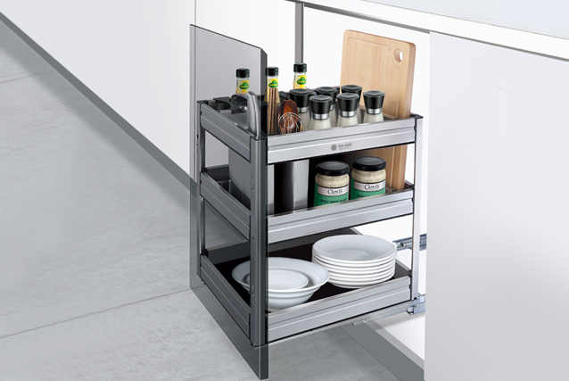 → 設計:標配星徽阻尼滑軌,開合順滑流暢、靜音自動回位;設有便捷調味品區、菜板存放設計、便捷高瓶區、全功能刀架和廚具獨立存放區。